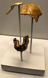 The first recognised remains—OH 7, partial juvenile skull, hand, and foot bones dating to 1.75 million years ago (mya)—were discovered in Olduvai Gorge, Tanzania, in 1960 by Jonathan Leakey. However, the actual first remains—OH 4, a molar—were discovered by the senior assistant of Louis and Mary Leakey (Jonathan's parents), Heselon Mukiri, in 1959, but this was not realised at the time.[2] By this time, the Leakeys had spent 29 years excavating in Olduvai Gorge for early hominin remains, but had instead recovered mainly other animal remains as well as the Oldowan stone-tool industry. The industry had been ascribed to Paranthropus boisei (at the time "Zinjanthropus") in 1959 as it was the first and only hominin recovered in the area, but this was revised upon OH 7's discovery.[2] In 1964, Louis, South African palaeoanthropologist Phillip V. Tobias, and British primatologist John R. Napier officially assigned the remains into the genus Homo, and, on recommendation by Australian anthropologist Raymond Dart, the specific name H. habilis, meaning "able, handy, mentally skillful, vigorous" in Latin.[3] The specimen's association with the Oldowan (then considered evidence of advanced cognitive ability) was also used as justification for classifying it into Homo.[4] OH 7 was designated the holotype specimen.[3]