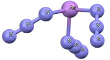 As(N3)3 can be prepared from the fluoride exchange route, and the resulting crystal structure has EO bridging of two of the azido groups, giving a coordination number of 7 and an infinite zig-zag chain structure.[64] However, the solution state 14N NMR of  As(N3)3 confirms that this compounds are in fact monomeric in solution, and the lone pair of arsenic is calculated to be sterically active as evidenced by the optimized gas phase geometry and contour plot of the total electron density.[64][65] Unlike phosphorus, the parent arsenic(V) azide has been isolated as As(N3)5 and exists as a yellow liquid.[66] The entire series of arsenic azido ions have been reported, [As(N3)4]-, [As(N3)4]+, and [As(N3)6]-.[65][67] The cationic species have the shortest As-N and Nβ-Nγ distance whereas the anionic ones tend to have much longer As-N distances and therefore partially explains why the cationic compounds tend to be much more explosive.[67]