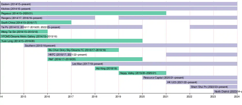 As of 2023–24 season, a total of 11 teams currently participate in the Hong Kong Premier League.