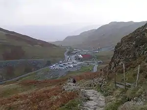 Honister Pass is a mountain pass in the Lake District in Cumbria, England. It is located on the B5289 road, linking Seatoller, in the valley of Borrowdale, to Gatesgarth at the southern end of Buttermere. The pass reaches an altitude of 1,167 feet (356 m), making it one of the highest in the region, and also one of the steepest, with gradients of up to 1-in-4 (25%).[1] The saddle at the watershed is known as Honister Hause, using the Cumbrian word hause for such a feature.