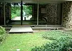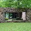 One of the most immediately apparent as well as fundamentally important features of this home is its "binuclear" design: A central courtyard divides the house into living/dining/cooking/entertaining and family/bedroom areas. The front door faces the center of the courtyard, where glass doors and a large rectangular opening in the stone of the rear wall frame an unobstructed view literally through the home and to Lake Roland to the east. Not only is this impressive visually, but the "binuclear" design is extremely practical for the family occupying the home: guests can be entertained in the living room in the south wing of the house, without disturbing family members in their bedrooms in the north wing of the house. The impressive noise management is enhanced by the thick stone walls, one of which is on the side of the family wing facing the courtyard, broken only by a relatively narrow doorway to the front entry hall. In the two images below, the living area/bedrooms are to the right, and the living room/kitchen/dining room are on the left. The perspective is actually "backwards", in that these images are looking from the rear of the house towards the front door (facing west). Many images of the home are taken from this perspective, as this side of the house faces the lake and is covered in glass, while the west wall is a long wall of Maryland fieldstone, broken only by the front door and otherwise relatively featureless. Every room except for the bathrooms, the "family room", and the kitchen are located along the home's periphery and therefore have an entire wall that is made of glass, half of which is a floor to ceiling sliding-glass door. The living room actually has three such doors because there is so much glass.