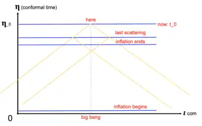 This spacetime diagram shows how the light cones for two light particles spaced some distance apart at the time of last scattering (ls) do not intersect (i.e. they are causally disconnected). The horizontal axis is comoving distance, the vertical axis is conformal time, and the units have the speed of light as 1. For reference.