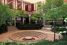 The hospital has a Seville courtyard with a stepped central fountain with circular steps that are decorated with tiles. Around the courtyard are galleries with Tuscan arches on marble columns with ática bases. The fountain was designed by Bernardo Simón de Pineda and built by Francisco Rodríguez, the tiles on the fountain were made by Melchor Moreno.