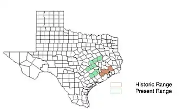 The Houston toad is generally found in areas with loose, sandy soils greater than 40 in (100 cm) in depth and large rolling uplands. Slow-moving or still bodies of water that last at least 30 days are needed for breeding and tadpole development.[16] The toad's original range covered 12 counties in Texas; currently, it is believed to occur in nine counties.[1] However, choruses have only been actually reported in three counties since 2000, representing a seventy-five percent overall reduction in twenty years. Vegetation of its preferred habitat includes loblolly pine, post oak, bluejack oak, yaupon holly, curly threeawn, and little bluestem. They are typically found in water sources such as shallow ponds, rain pools, flooded fields, or man-made ponds which can occur for up to 30 days during the breeding and egg/tadpole development process.[15]