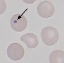 This DNA appears as a basophilic (purple) spot on the otherwise eosinophilic (pink) erythrocyte on a standard H&E stained blood smear. These inclusions are normally removed by the spleen during erythrocyte circulation, but will persist in individuals with functional hyposplenia or asplenia.