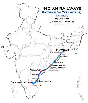 The SMVT Bengaluru - Howrah SF Express formerly Howrah - Yesvantpur Superfast express, is a Superfast train belonging to the South Eastern Railway zone that runs between Howrah Junction and Bengaluru in India. It is currently being operated with 12863/12864 train numbers on a daily basis.[1][2][3]