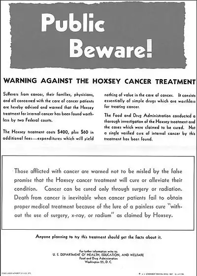 Hoxsey Therapy or Hoxsey Method is an alternative medical treatment promoted as a cure for cancer. The treatment consists of a caustic herbal paste for external cancers or a herbal mixture for "internal" cancers, combined with laxatives, douches, vitamin supplements, and dietary changes. Reviews by major medical bodies, including the U.S. Food and Drug Administration (FDA), the National Cancer Institute, the American Cancer Society,[1] M. D. Anderson Cancer Center,[2] and Memorial Sloan-Kettering Cancer Center,[3] have found no evidence that Hoxsey Therapy is an effective treatment for cancer. The sale or marketing of the Hoxsey Method was banned in the United States by the FDA on September 21, 1960 as a "worthless and discredited" remedy and a form of quackery.[4]