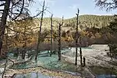 Huanglong (simplified Chinese: 黄龙; traditional Chinese: 黃龍; pinyin: Huánglóng; lit. 'yellow dragon') is a scenic and historic interest area in the northwest part of Sichuan, China. It is located in the southern part of the Minshan mountain range, 370 kilometres (230 mi) north-northwest of the capital Chengdu.[1] This area is known for its colorful travertine pools formed by calcite deposits, especially in Huanglonggou (Yellow Dragon Gully), as well as diverse forest ecosystems, snow-capped peaks, waterfalls and hot springs. Huanglong is also home to many endangered species including the giant panda and the Sichuan golden snub-nosed monkey.[1] In addition, a large population of the endemic orchid species 'Cypripedium plectrochilum' was discovered at the site [2] Huanglong was declared a World Heritage Site by UNESCO in 1992 because of its outstanding travertine formations, waterfalls and limestone formations as well as its travertine terraces and lakes rating among the three most outstanding examples in the world.[1][3]