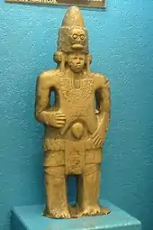 The Huastecs arrived in the Huasteca between 1500 BCE[10] and 900 BCE.[11] The linguistic evidence is corroborated by archaeological discoveries. In 1954, Richard Stockton MacNeish found ceramics and figurines in the Middle Formative period, called "Pavon de Panuco" in the Panuco River sites of the Huasteca, which resemble Preclassic objects from Uaxactun, a Petén-region Maya site.[12] A date of no earlier than 1100 BCE for the Huastecs’ arrival at their present location seems most likely, since they probably had not arrived at the north-central Veracruz site of Santa Luisa until about 1200 BCE, the phase at the end of the Early Formative period known locally as the "Ojite phase."[13] Artifacts of the period include Panuco-like basalt manos and metates.[14] (The Huastecs remained in Santa Luisa, located east of Papantla near the Gulf coast, until supplanted or absorbed by the Totonacs around AD 1000).