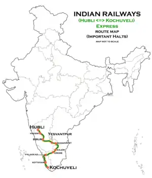 The Hubballi–Kochuveli Superfast Express is an Express train belonging to South Western Railway zone that runs between Hubli Junction and Kochuveli.It began operations as KOCHUVELI YESWANTHAPUR WEEKLY EXPRESS express and later extended to Hubbali.It is currently being operated with 07359/07360 train numbers on a weekly basis.[1][2] It has inconvenient timings and since the day of running is not suitable,It mostly runs empty.