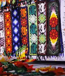 Notable Huichol artists include Emeteria Ríos Martínez, who has done a number of yarn painting murals.[6] José Benítez Sánchez is a shaman-artist, who helped to expand yarn painting from its early decorative function to larger more vision like pieces.[7] Pablo Taizan is also a shaman in the village of Mesa de Tirador. He principally does beadwork featuring animal figures used in healing.[2] Santos de la Torre made a great mural for the metro station Palais Royal at the Louvre, Paris.[8] In 2013 Mexican portrait documentary 'Echo of the Mountain', originally known in Spanish as Eco de la montaña[9] directed by Nicolás Echevarría released based on his experiences during the mural creation.