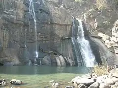 The Hundru Falls at one of the edges of the Ranchi plateau is one of the several scarp falls in the region.[8] During rainy season it takes a formidable form but in the dry season it turns into an exciting picnic spot.[9] At the base of the Hundru Falls, there is a pool, which serves as a bathing place.[5]