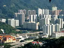 Festival City (名城) is a HK$20 billion residential development project by Cheung Kong and MTR Corporation located above the Tai Wai (Station) Maintenance Centre. Phase I was completed in September 2010, Phase II in October 2011, and Phase III in August 2012. The plan was to build 12 50-stories high residential towers with a total construction area of 313,955 square meters as well as 25,890 square meters for the general public's use. It offers 4,264 flats to families, two schools and one community facility. This residential project raised the population of Tai Wai significantly. The controversy of this project is that the 12 towers would create an urban heat island effect and block off the air flow of the area.[7][8]