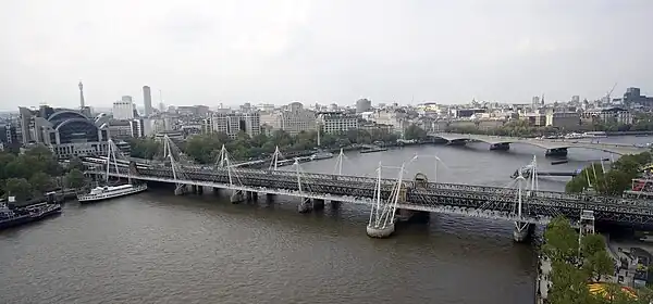 The Hungerford Bridge crosses the River Thames in London, and lies between Waterloo Bridge and Westminster Bridge. Owned by Network Rail Infrastructure Ltd (who use its official name of Charing Cross Bridge) it is a steel truss railway bridge flanked by two more recent, cable-stayed, pedestrian bridges that share the railway bridge's foundation piers, and which are named the Golden Jubilee Bridges.[1][2][3]