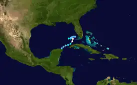In late May, a tropical disturbance gradually developed over the northwestern portion of the Caribbean. It drifted westward into the Yucatán Peninsula, and on June 1 the convection organized into a circular cloud pattern in association with a low pressure system. The system tracked northeastward into the Gulf of Mexico while continuing to organize, and subsequent to the formation of a low-level circulation it developed into Tropical Depression One while located about 40 miles (64 km) north-northwest of Cancún. Reconnaissance Aircraft confirmed the existence of the tropical depression later that day.[2] Early on June 3, it is estimated the depression intensified into Tropical Storm Alberto while located about 150 miles (240 km) north-northwest of the western tip of Cuba, based on a ship report of 45 mph (72 km/h) winds about 115 miles (185 km) south of its center.[3] An Air Force flight was scheduled into the storm, though was forbidden by the Cuban government due to its presence in Cuban airspace.[4]