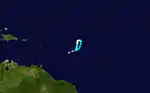 On September 22, a tropical wave moved into the eastern Caribbean Sea,[1] spawning a tropical depression near Hispaniola early on September 24.[4] As it tracked west-northwestward, the low dropped heavy rainfall, peaking at 4.42 in (112 mm) in Christiansted, United States Virgin Islands, as well as 11.9 in (300 mm) in Garzas, Puerto Rico.[15] In Puerto Rico, the rains caused landslides that affected seven towns, notably Ponce, the island's second-largest city.[16] There, at least 14 buildings were destroyed.[17] The floods left more than 1,000 people homeless, 300 of whom took refuge in a Red Cross shelter.[16] Overall, the flooding on the island killed four people and left moderate damage of around $1 million (1952 USD, $11 million 2024 USD).[1]