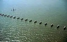 Frederic made landfall at Dauphin Island, Alabama and continued across to a point on the Alabama/Mississippi state line near Bayou La Batre, Alabama.[32] Near-total property damage occurred along the Alabama coastline between Fort Morgan and Gulf Shores, the latter seeing 80% of its buildings completely destroyed. The causeway linking Dauphin Island to the mainland was swept away in many areas.[28] Alabama's second-largest city (at that time), Mobile, Alabama suffered extensive damage as well. Wind damage was also severe, especially across southern Alabama. Hurricane-force gusts were felt as far inland as Choctaw County. Structural failure was widespread in the immediate landfall area with industrial, residential and governmental buildings as well as hospitals suffering heavy damage. Nearly 90% of the Mobile area lost electricity, and the historic City Hall experienced heavy roof damage. Many small beach houses were completely destroyed by high winds before the storm surge could add any effects.[28][33] Tree damage with broken limbs was extensive, leaving thousands of tall pine trees all tilted, leaning in the direction of the wind.[1] 11 Alabama counties were declared disaster areas.