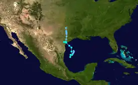An area of disturbed weather developed into Tropical Depression Three at 0600 UTC on August 21, while located about 305 miles (491 km) east-southeast of Brownsville, Texas. The depression moved generally northwestward throughout its duration. Based on data from oil platforms in the northern Gulf of Mexico, the depression was upgraded to Tropical Storm Charley at 1800 UTC on August 21. The storm intensified further, with reconnaissance aircraft reporting sustained winds of 70 mph (110 km/h) at 0600 UTC on August 22. Shortly thereafter, Charley weakened and only four hours later, it made landfall near Port Aransas, Texas with winds of 45 mph (72 km/h). Late on August 22, the system weakened to a tropical depression. Charley persisted as a tropical cyclone for about 24 hours longer, before dissipating near Del Rio, Texas.[24]