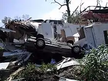 Moderate rainfall from Kyle in South Carolina peaked at 6.35 inches (161 mm) in Edisto Beach, with the precipitation resulting in minor urban flooding.[1] In and around St. Stephen, flooding reached several feet in depth in roads and buildings; there, a nursing home had to be evacuated because of flooding.[36] High waters in Manning severely damaged 17 mobile homes, forcing about 50 people to move to shelters.[37] Ten car accidents were reported in Florence.[38] The tropical storm spawned an F2 tornado in Georgetown that remained on the ground for about 1.25 miles (2.01 km). At its peak strength, the tornado overturned five mobile homes and a car.[39] The tornado destroyed seven homes and damaged 106 buildings, 28 severely. Eight people were injured by the tornado.[40]