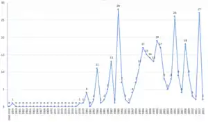 A study conducted by David Bandurski as part of the China Media Project at the University of Hong Kong selected 143 text samples of the phrase from excerpts from the People's Daily published between 1959 and 2015; from this sample, Japan was most frequently accused of "hurting the feelings of the Chinese people" with 51 occurrences, while the United States ranked second at 35 occurrences. In terms of specific issues which drew condemnation through the catchphrase, 28 were in relation to the political status of Taiwan, while the Tibetan sovereignty debate drew condemnation with the phrase 12 times.[4] Bandurski later wrote in 2019 that the phrase appears around at most four times in the People's Daily each year, though there was a slight uptick in 2012.[21]