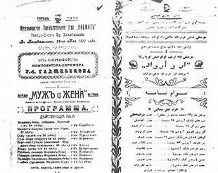 The operetta's themes centre on the family and everyday life, oppression in the family and Azerbaijani woman in society.[2] The premiere was held on May 24, 1910, in Baku, in the theatre-circus of the Nikitin brothers. Huseyngulu Sarabski (Marjan bey), Ahmed Agdamski (Minnat khanim), M.H.Teregulov (Safi) and Mirzagha Aliyev (Kerbelayi Gubad) played the leading parts, Huseyn Arablinski was the stage director and Uzeyir Hajibeyov was the conductor. Husband and Wife was subsequently staged in other theatres in Azerbaijan, including Nakhchivan, Aghdam and Shaki.[3][4][5][6]