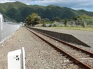 ![]() Hutt Park railway station, looking south. The platform now borders private land and the Hutt Valley Golf Course on the mothballed section of the Gracefield Branch line past the Hutt Workshops. | |