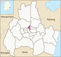 Hwangseong-dong is both an administrative and legal dong or a neighbourhood in the administrative subdivisions of the Gyeongju City, North Gyeongsang province, South Korea. It is bordered by Yonggang-dong on the east, Hyeongok-myeon on the west and north and Seongnae-dong on the south. Its 3.84 square kilometers are home to about 29,140 people.[2] It has two elementary schools, three middle schools and one high school[3]