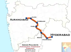 Hyderabad - Aurangabad Passenger is a passenger train belonging to South Central Railway zone that runs between Hyderabad Deccan and Aurangabad. It is currently being operated with 57549/57550 train numbers on a daily basis.[1][2][3]