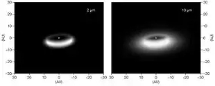 The disc around IRAS 08544−4431 at 2μm and 10μm. Although the image resembles a doughnut lit from the front, the brightest arc is the inner wall of the far side of the disc, lit by the stars at the centre.