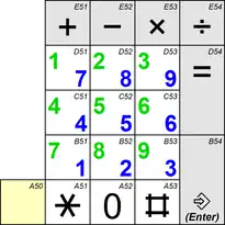 - at least 12 keys in row E (the upmost row) in positions E00 to E15, containing all keys to input the decimal digits,