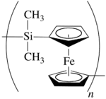 ]Some regular single-strand inorganic polymers can be named like organic polymers using the rules given above, e.g., −[O−Si(CH3)2]n− and −[Sn(CH3)2]n− are named poly[oxy(dimethylsilanediyl)] and poly(dimethylstannanediyl), respectively.[13] Inorganic polymers can also be named in accordance with inorganic nomenclature, but the seniority of the elements is different from that in organic nomenclature. However, certain inorganic and inorganic-organic polymers, for example those containing metallocene derivatives, are at present best named using organic nomenclature, e.g., the polymer shown can be named poly[(dimethylsilanediyl)ferrocene-1,1'-diyl].