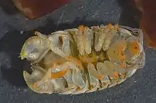 Several orange-coloured specimens in the brood pouch of a larger isopod