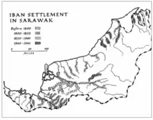 Based on the research conducted by Benedict Sandin (1968), the period of Iban migrations from the Kapuas Hulu Range were determined to commenced from the 1750s.[17] These settlers were identified to enter Batang Lupar and established settlement adjacent to the Undop River. In the period of five generations, they expanded towards west, east and north, founding new settlements within the tributaries of Batang Lupar, Batang Sadong, Saribas and Batang Layar.
