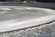 Ice discs form on the outer bends in a river where the accelerating water creates a force called 'rotational shear', which breaks off a chunk of ice and twists it around.[2] As the disc rotates, it grinds against surrounding ice — smoothing into a circle.[3] A relatively uncommon phenomenon, one of the earliest recordings is of a slowly revolving disc spotted on the Mianus River and reported in an 1895 edition of Scientific American.[4][5]