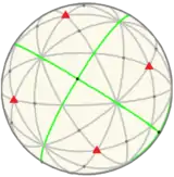 | The pyritohedral symmetry is an index 5 subgroup of icosahedral symmetry, with 3 orthogonal green reflection lines and 8 red order-3 gyration points. There are 5 different orientations of pyritohedral symmetry. | |