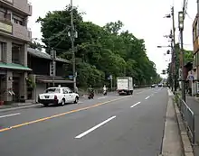 Imadegawa Street is now located between Itsutsuji Street to the north and Motoseiganji Street to the south, and is considered narrow for a major road.[1] The street passes on the north side of the Kyoto Imperial Palace and for this reason, the northern gate of the garden receives the name of Imadegawa Gomon.[1] Several universities are located along the street and for this reason its east section is considered a student district.[1]