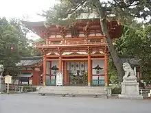 Imamiya Shrine (今宮神社, Imamiya-jinja) is a Shinto shrine located in Kita-ku, Kyoto, Japan. It was originally established for patrons to pray for safety from an epidemic, though it has evolved into a shrine where patrons can pray for general good health. The shrine complex is embedded in a forest of large trees northwest of Daitoku-ji and includes many minor shrines in addition to the main shrine, or honden.[1] On every second Sunday in April, one of the 3 major festivals in Kyoto, Yasurai Matsuri, is held at the shrine. The word imamiya (今宮) means "newly constructed."[2]