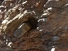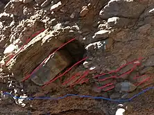 Note how the clasts are oriented at an angle to the base of the channel (blue line), which was originally approximately horizontal.