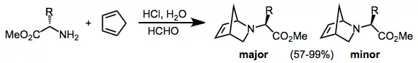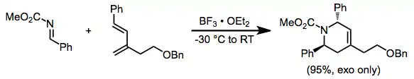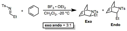 Attaching an electron-withdrawing group to the imine nitrogen increases the reactivity of the imine. The exo isomer usually predominates (particularly when cyclic dienes are used), although selectivities vary.[7]