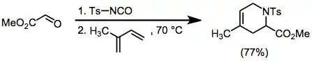 Tosylimines may be generated in situ from tosylisocyanate and aldehydes. Cycloadditions of these intermediates with dienes give single constitutional isomers, but proceed with moderate stereoselectivity.[8]