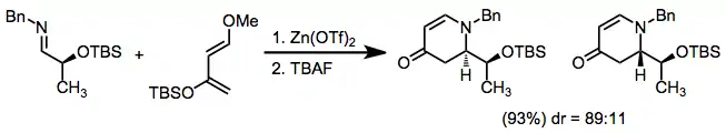 - ↑ Ishimaru, K.; Watanabe, K.; Yamamoto, Y.; Akiba, K.-Y. (1994). "Stereocontrol in \4+2]Type Cycloaddition of an Aldimine Derived from (S)-Ethyl Lactate with 2-Siloxy-1,3-butadienes". Synlett. 1994 (7): 495. doi:10.1055/s-1994-22902.