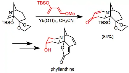 The IDA reaction has been applied to the synthesis of a number of alkaloid natural products. Danishefsky's diene is used to form a six-membered ring en route to phyllanthine.[12]