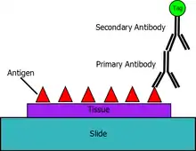 Immunolabeling is a biochemical process that enables the detection and localization of an antigen to a particular site within a cell, tissue, or organ. Antigens are organic molecules, usually proteins, capable of binding to an antibody. These antigens can be visualized using a combination of antigen-specific antibody as well as a means of detection, called a tag, that is covalently linked to the antibody.[1] If the immunolabeling process is meant to reveal information about a cell or its substructures, the process is called immunocytochemistry.[2] Immunolabeling of larger structures is called immunohistochemistry.[3]