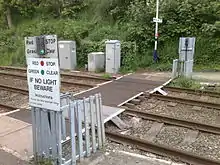 There is level access from the small car park at the front of station onto the Helsby platform. From this platform, to reach the Ellesmere Port platform, turn left, go down the platform end ramp, and providing the level crossing warning lights indicate that it is safe, cross the lines using the foot crossing and then up the platform end ramp.