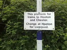 Some station signs are outdated, displaying information about those former services to Chester and Hooton (see image of sign on Platform 2).