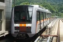 The ITC Line2 is a driverless, fully automatic subway system. The line uses 37 two-car trains, all of which were built in 2013 by Hyundai Rotem, a member of Hyundai Motor Group.[4][5] They are similar to the Canada Line cars in Vancouver, Canada, albeit using the narrow light metro body (2.65 m (8 ft 8 in)) and external sliding doors as opposed to the heavy metro wide body 3 m (9 ft 10 in) and pocket doors, and using a bottom contact third rail instead of the North American top contact.