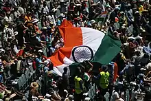 In September 2007, India won the first-ever ICC Men's T20 World Cup held in South Africa, beating Pakistan by 5 runs in the final.[56] On 2 April 2011, India won the 2011 Cricket World Cup by defeating Sri Lanka in the final, thus becoming the third team after West Indies and Australia to win the World Cup twice.[57] India also became the first team to win the World Cup on home soil.[58] India defeated England in the 2013 ICC Champions Trophy Final and captain M. S. Dhoni became the first men's cricket team captain in history to win the three major ICC trophies, namely the Cricket World Cup, ICC Men's T20 World Cup and ICC Champions Trophy.[59][60]
