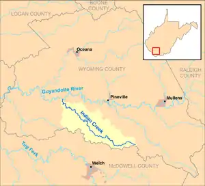 Indian Creek is a tributary of the Guyandotte River, 19.7 miles (31.7 km) long,[3] in southern West Virginia in the United States. Via the Guyandotte and Ohio rivers, it is part of the watershed of the Mississippi River, draining an area of 43 square miles (110 km2)[4] in a rural area on the unglaciated portion of the Allegheny Plateau.