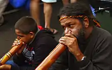 Indigenous music of Australia comprises the music of the Aboriginal and Torres Strait Islander peoples of Australia, intersecting with their cultural and ceremonial observances, through the millennia of their individual and collective histories to the present day.[1][2][3][4] The traditional forms include many aspects of performance and musical instrumentation that are unique to particular regions or Aboriginal Australian groups; and some elements of musical tradition are common or widespread through much of the Australian continent, and even beyond. The music of the Torres Strait Islanders is related to that of adjacent parts of New Guinea. Music is a vital part of Indigenous Australians' cultural maintenance.[5]