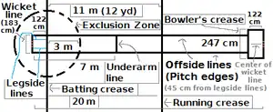 The length of an indoor cricket pitch is the same as a conventional cricket pitch, and has 3 stumps at each end, but there the similarities end. The pitch is marked in line with the stumps at each end, and is 1.83 metres in width at the batting end and 2.47 metres at the bowling end, with the stumps in the centre, and the middle stumps are 20 metres apart. The popping crease is in front of, and parallel with, the wicket lines at both ends. At the bowler's end, the pitch is specified as the line extending between the return creases and will be called the bowler's crease or the front foot line. The return creases of the pitch at the bowler's end is marked by a lines at right angles to the bowling crease to the line of the wickets. The return creases are marked 1.22 metres from the middle stump on the line of the wicket. The running crease (or non-striking batter's crease), which is the edge of the crease marking nearest the bowling end, is parallel to the popping crease and extends from one side of the court to the other. The distance between the running crease and the batting crease is 11 metres.[1]